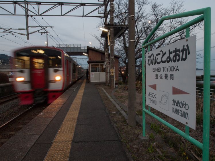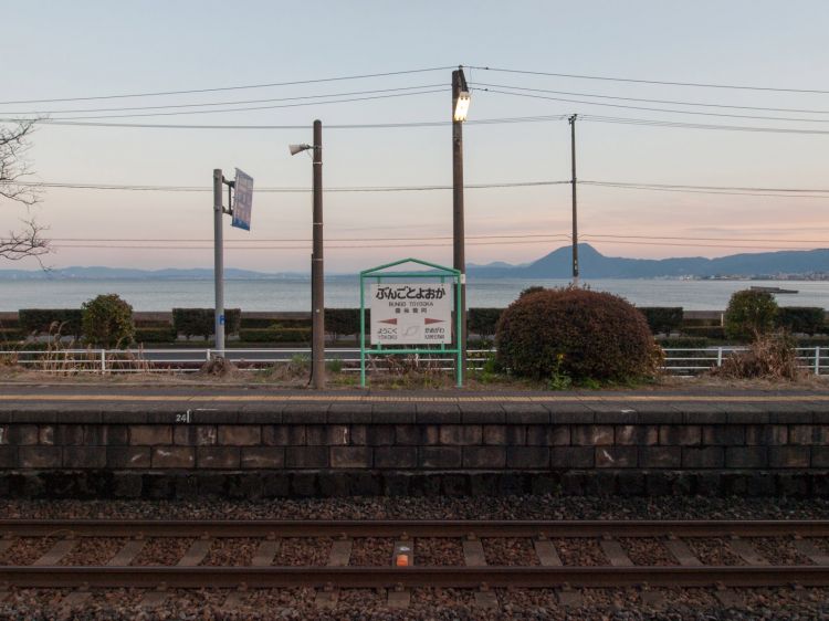 丰后丰冈站位于大分县速见郡日出町境内的“JR日豊本線”上,每逢日暮,列车沿着别府湾驶入木造的车站,看着车站站员目迎远送的背景,已然一道独特的风景。从丰后丰冈站月台望向别府湾,可以看见对岸的高崎山、大分市区。夜晚时分,景色更佳!